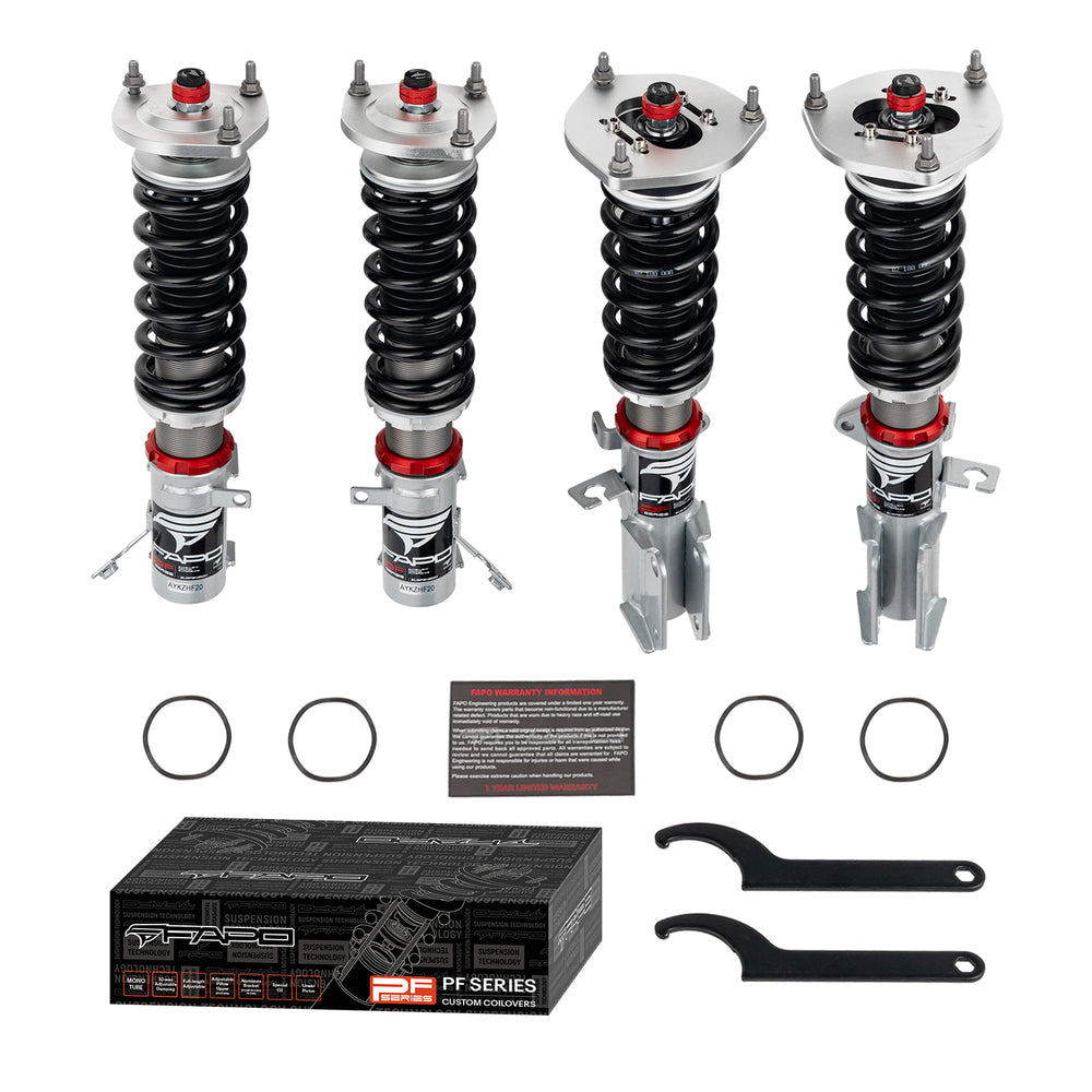 Note: This coilover kit is designed to lower your car by 1"-1.5" compared to the factory height, even at its maximum setting. Please confirm this suits your needs before purchasing.